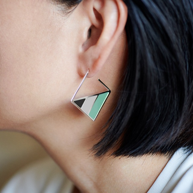 3色のストライプが耳に映えるピアス。